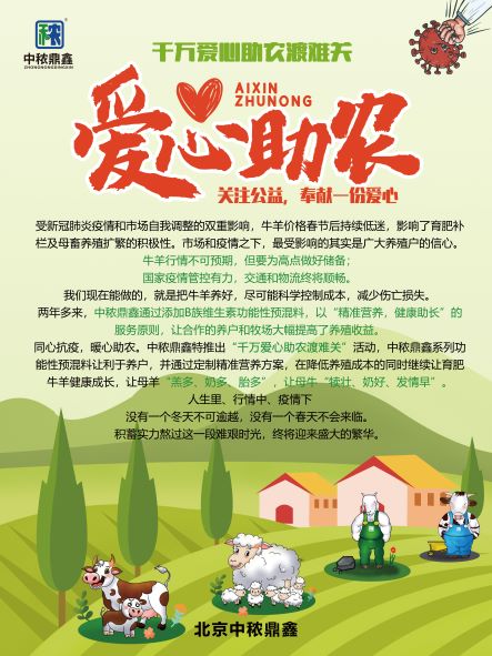 同心抗疫,暖心助農。中秾鼎鑫特推出“千萬愛心助農渡難關”活動,中秾鼎鑫系列功能性預混料讓利于養(yǎng)戶,并通過定制精準營養(yǎng)方案,在降低養(yǎng)殖成本的同時繼續(xù)讓育肥牛羊健康成長,讓母羊“羔多、奶多、胎多”,讓母牛“犢壯、奶好、發(fā)情早”。