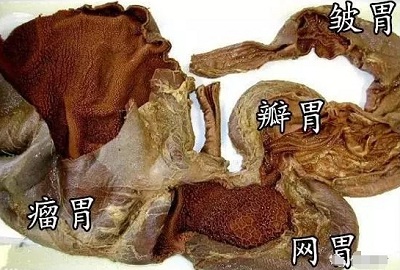 反芻動物采食一般比較匆忙,特別是粗飼料,大部分未經充分咀嚼就吞咽進入瘤胃,經過瘤胃浸泡和軟化一段時間后,食物經逆嘔重新回到口腔,經過再咀嚼,再次混入唾液并再吞咽進入瘤胃。可以是由瘤胃直接逆嘔上行至口,也可以從瘤胃陸續進入網胃,再由網胃返回口中,經口腔中頰齒的細細咀嚼后再次咽回瘤胃。這一反芻和咀嚼過程可以再次重復進行,直至徹底嚼碎后,食物再從瘤胃經網胃而入瓣胃。瓣胃近球形,內壁有許多平行的葉片(故俗稱百葉)。瓣胃的葉片提供廣大的面積,食糜在葉片間受到壓擠,使成更細碎的食糜,同時,瓣胃也吸收一部分水和低級脂肪酸皺胃是唯一分泌消化液的部分,相當于其它獸類的胃本體,胃腺的分泌物中含有胃蛋白酶鹽酸 。