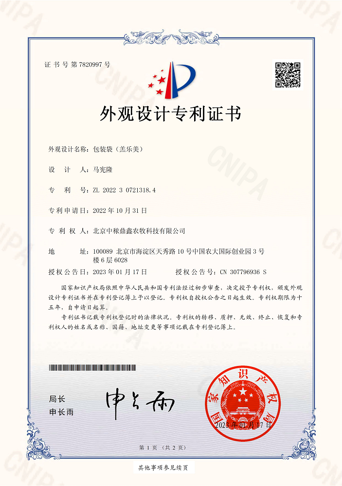 中秾鼎鑫外觀設計專利證書